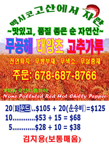 12월에 수확한 멕시코 고산 무공해 태양초 고추가루! 작성자 정보 riverflow 작성 작성일 2025.04.13 07:47 컨텐츠 정보 761 조회 목록 본문 12월에 수확한 멕시코 고산 무공해 태양초 고추가루! 관련자료 이전 새끼 진돗개 파실 분 연락 부탁드립니다. 작성일 2025.04.15 13:44 다음 압박 스타킹 작성일 2025.04.12 10:25 댓글 0 등록된 댓글이 없습니다. 로그인한 회원만 댓글 등록이 가능합니다. 목록