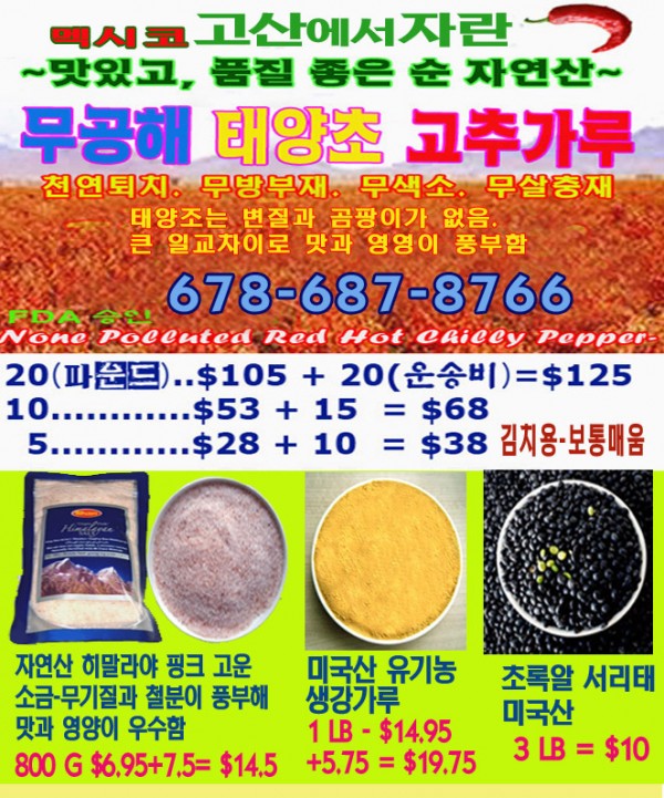 신선한 고추향과 맛 무공해 태양초 고추가루! 작성자 정보 riverflow 작성 작성일 2025.09.28 06:36 컨텐츠 정보 384 조회 목록 본문 신선한 고추향과 맛 무공해 태양초 고추가루! 관련자료 이전 비싼 나무 인당 한그루씩 드립니다. Woodbridge 지역. 좋은 나무 작성일 2025.09.30 13:31 다음 Imbera 영업용 원도어 유리쿨러(25x23x55`) $885. QBD 작성일 2025.09.26 13:33 댓글 0 등록된 댓글이 없습니다. 로그인한 회원만 댓글 등록이 가능합니다. 목록