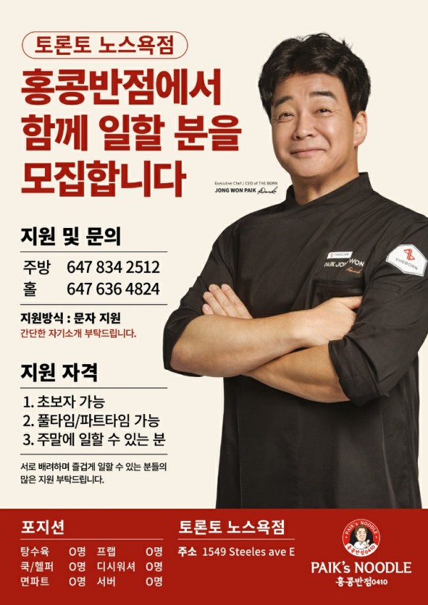홍콩반점 노스욕 지점 구인 작성자 정보 뚜벅뚜벅뚝배기 작성 작성일 2023.03.31 15:13 컨텐츠 정보 2,312 조회 목록 본문 포지션: 탕수육, 면 파트, 쿡 헬퍼. 파트타임 가능. 주말 가능하신 분. 관련자료 이전 Genesis Markham에서 함께하실 Genesis Experienc 작성일 2023.04.04 08:58 다음 해외 선교에 동참하실 분. 중미와 남미에 단기 선교 같이 가실 분과 개신 작성일 2023.03.31 08:53 댓글 0 등록된 댓글이 없습니다. 로그인한 회원만 댓글 등록이 가능합니다. 목록