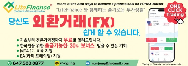 당신도 외환거래(FX) 쉽게 할 수 있습니다, 라이트 파이낸스 작성자 정보 관리자 작성 작성일 2023.08.24 15:15 컨텐츠 정보 961 조회 목록 본문 당신도 외환거래(FX) 쉽게 할 수 있습니다. LiteFinance와 함께하는 슬기로운 투자생활.● 기초부터 전문가과정까지 무료로 알려드립니다. ● 한국인을 위한 출금 가능한 30% 보너스 받을 수 있는 기회. ● MT4 1:1 교육 지원. ● EA(카피 드레이딩) 지원.카톡ID: roxyjung roxyjung@hotmail.com ⓔ: roxyjung@hotmail.com☎647.500.0877 관련자료 이전 김씨네 맛있는 김 작성일 2023.08.28 15:27 다음 온타리오 사립 고등학교, 롱브리지 아카데미 작성일 2023.08.18 10:24 댓글 0 등록된 댓글이 없습니다. 로그인한 회원만 댓글 등록이 가능합니다. 목록