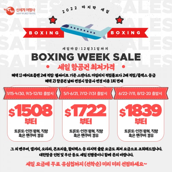 신세계 여행사♦한국행 특가 항공권 안내♦한국 유심칩/배기지택 증정 행사중♦ 416 536 5000♦ 작성자 정보 신세계여행사 작성 작성일 2023.01.02 07:13 컨텐츠 정보 1,278 조회 목록 본문 신세계 여행사에서 한국행 특가 항공권 및 캐러비안등 다양한 여행 상품을 소개 하여 드립니다. 한국에서 한달간 무제한으로 사용 하실수 있는 유심칩과 배기지 택을 선물로 드리는 행사 중이니 많은 이용 부탁 드립니다. 새해 복 많이 받으세요 ~ 관련자료 이전 **신세계 여행사 **새해 맞이 에어캐나다 초 특가**비수기 왕복 $1399부터**프리미엄이코노미/비지니스**보너스마일리지**416 536 5000** 작성일 2023.01.05 10:15 다음 천기누설 사주 작성일 2022.12.22 17:44 댓글 0 등록된 댓글이 없습니다. 로그인한 회원만 댓글 등록이 가능합니다. 목록