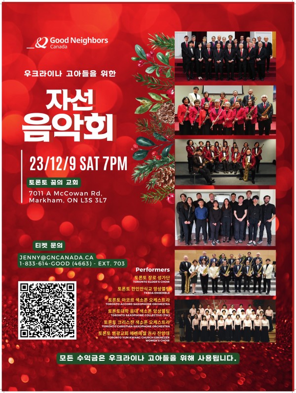 굿네이버스 캐나다 주최로 음악으로 나누는 희망: 100인과 함께하는 굿네이버스 자선 콘서트를 계획하고 있다. 토론토에서 활동하며 봉사와 사랑을 실천하는 아코르 섹소폰 오케스트라를 비롯하여 장로성가단, 염광교회 권사찬양단, 토론토대학 음대 색소폰 앙상블팀 등, 총 6개 참가팀으로 구성된 100인이 전쟁을 피해 루마니아로 피난 온 우크라이나 고아들에게 희망을 나누고자 한다.
