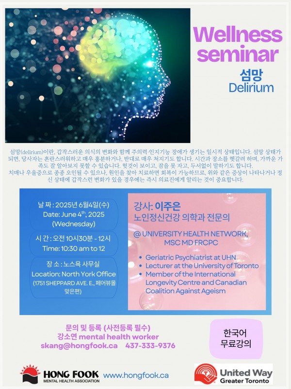 홍푹정신건강협회에서 오는 6월4일 (수) 오전에 섬망을 주제로 정신건강 세미나를 준비하고 있습니다.