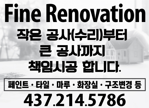 파인 레노베이션 작성자 정보 관리자 작성 작성일 2023.07.12 11:27 컨텐츠 정보 914 조회 목록 본문 Fine Renovation에서 수리와 같은 작은 공사부터 큰 공사까지 책임시공 해드립니다.◆페인트 ◇타일 ◆마루 ◇화장실 ◆구조변경 등 관련자료 이전 요크미술학원 캐나다 미대입시전문 작성일 2023.07.12 14:15 다음 LA 비즈니스 홍보 대행업체 [초기비용 없음] - 사장님들의 비즈니스를 지구 구석구석까지 홍보해 드리도록 하겠습니다. 작성일 2023.07.12 00:19 댓글 0 등록된 댓글이 없습니다. 로그인한 회원만 댓글 등록이 가능합니다. 목록