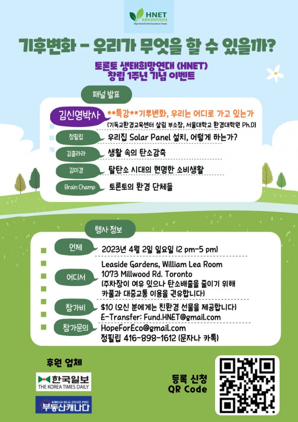 토론토 생태희망연대(HNET)는 4월2일 Leaside Garden에서 창립 1주년 이벤트를 준비했습니다.