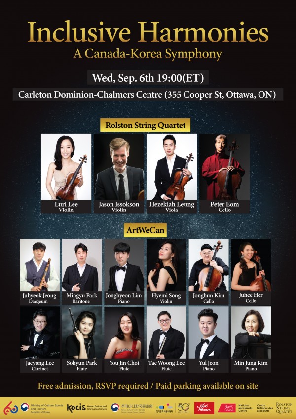 주캐나다한국문화원(이하 문화원, 원장이성은)과 해외문화홍보원(KOCIS, 원장 김장호)은 한국과 캐나다의 수교 60주념을 맞이하여 캐나다 캘거리에 소재한 전국장애인예술센터(National access Art Centre)과 함께 한국발달장애인문화예술협회 아트위캔과 토론토를 대표하는 롤스톤 (ROLSTON) 현악 콰르텟을 초청하여 <INCLUSIVE HARMONIES> 합동 클래식 공연을 개최한다. 본 공연은 200년의 역사가 있는 오타와 시내에 위치한 칼튼 도미니언 찰머스 센터 (Carleton Dominion-Chalmers Centre) 에서 9월 6일 오후 7시에 개최된다.
